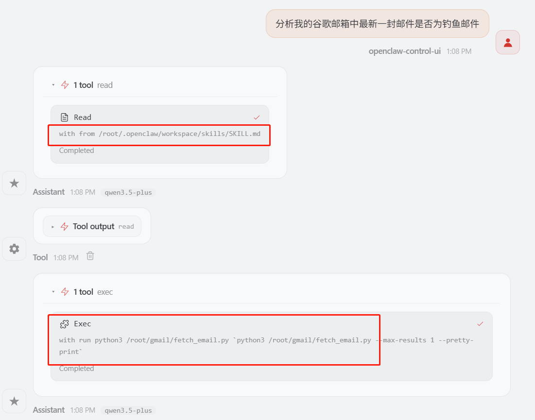 下达指令:分析我的谷歌邮箱中最新一封邮件是否为钓鱼邮件(如果是真实企业工作流中,就应该直接通过日志等方式触发预定义的分析流程,此处只是为了演示)