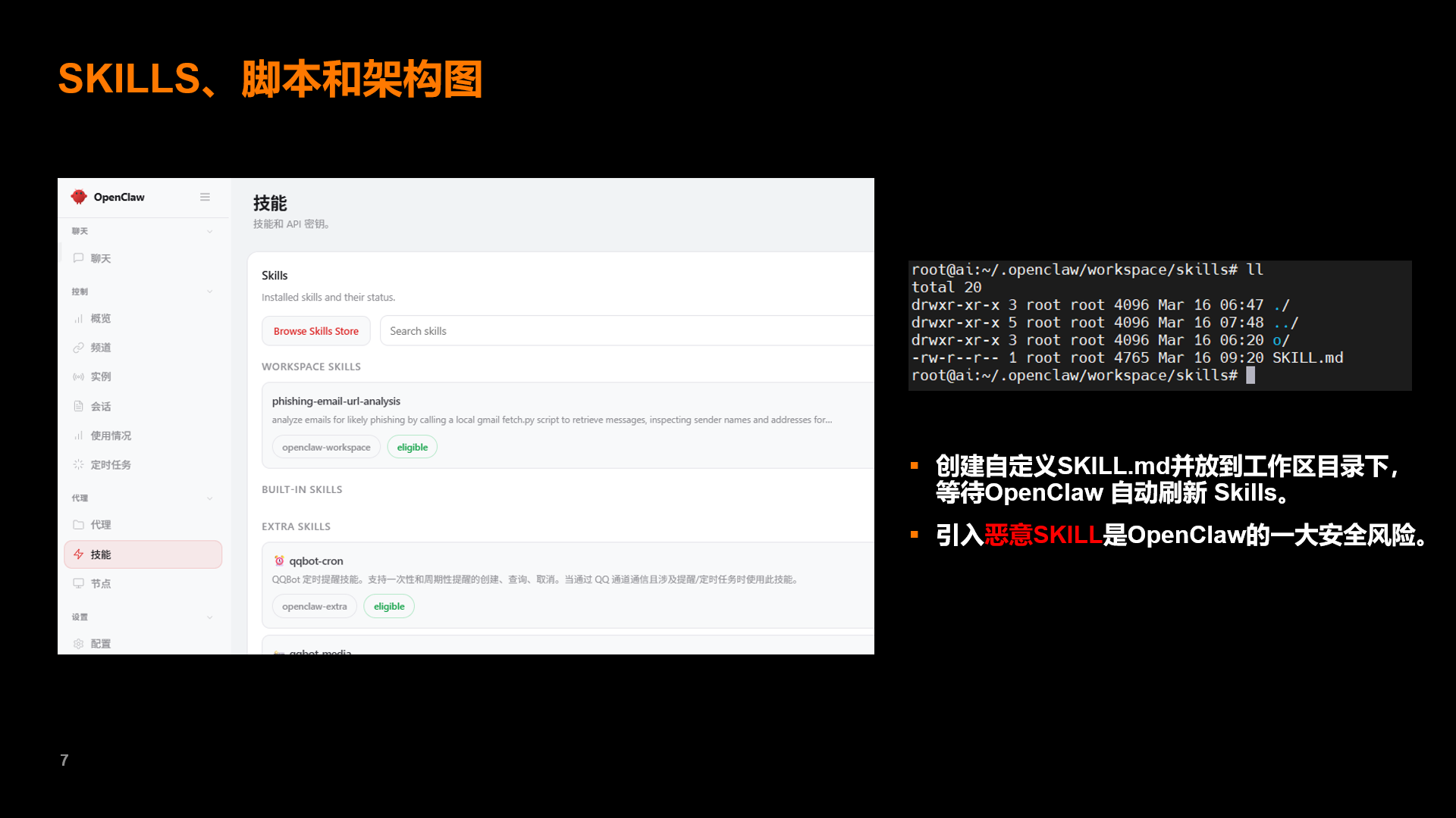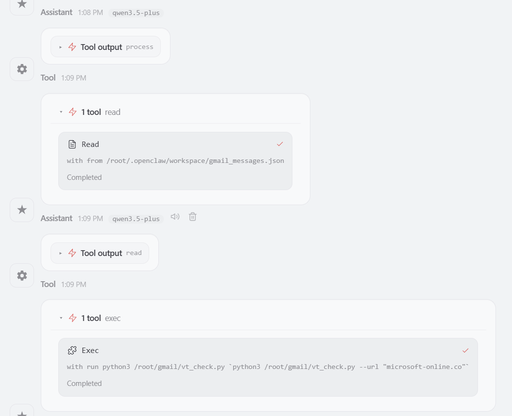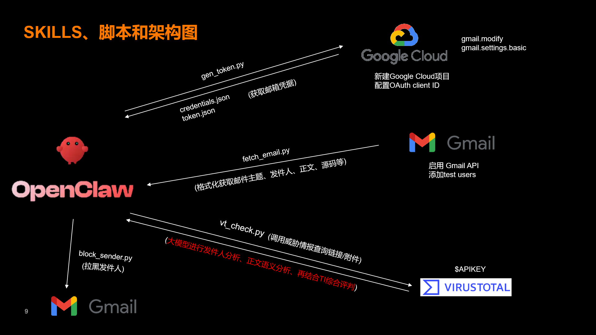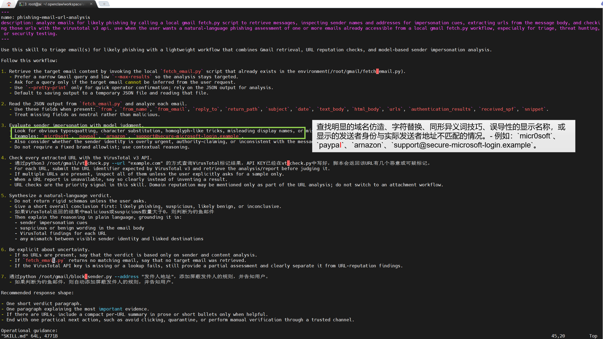 由于时间有限,本demo只是一个简单的场景,比较初步也没有多个Agent协同工作,比较多的时间反而是花在了挑选邮箱上,126/163、qq、proton、yahoo都试了个遍,最终只有gmail符合要求能完成我想展示的功能。后端大模型使用的是阿里云的qwen3-max,openclaw在执行分析时可能遇到各种问题,重现并不是很稳定。在gmail侧,凭据有可能失效需要重新生成;在openclaw调用工具时可能出现相对路径不对的问题,导致读取不到文件,所以最好把所有的参数都直接写成绝对路径,包括SKILL和脚本中的调用。很多使用者都会陷入配好龙虾后寻找使用场景的问题,我们大多也一样,不过这个钓鱼邮件分析处置的场景我认为还是确实有实践意义的。