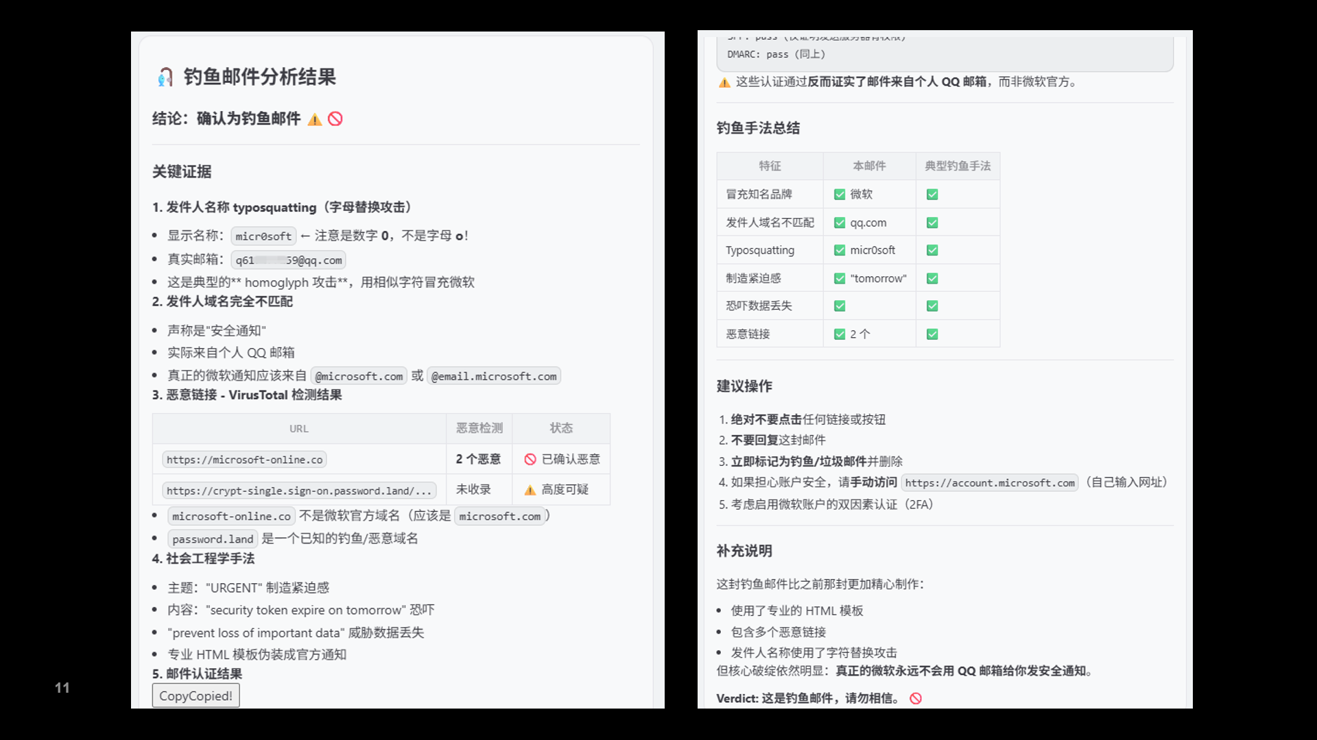 1. 分析邮件中的紧迫性、不合理性。在除了URL/附件/二维码的钓鱼方式外,还有发票财务欺诈等方式不易被传统的安全扫描发现,AI作为大语言模型有着天然的分析优势。