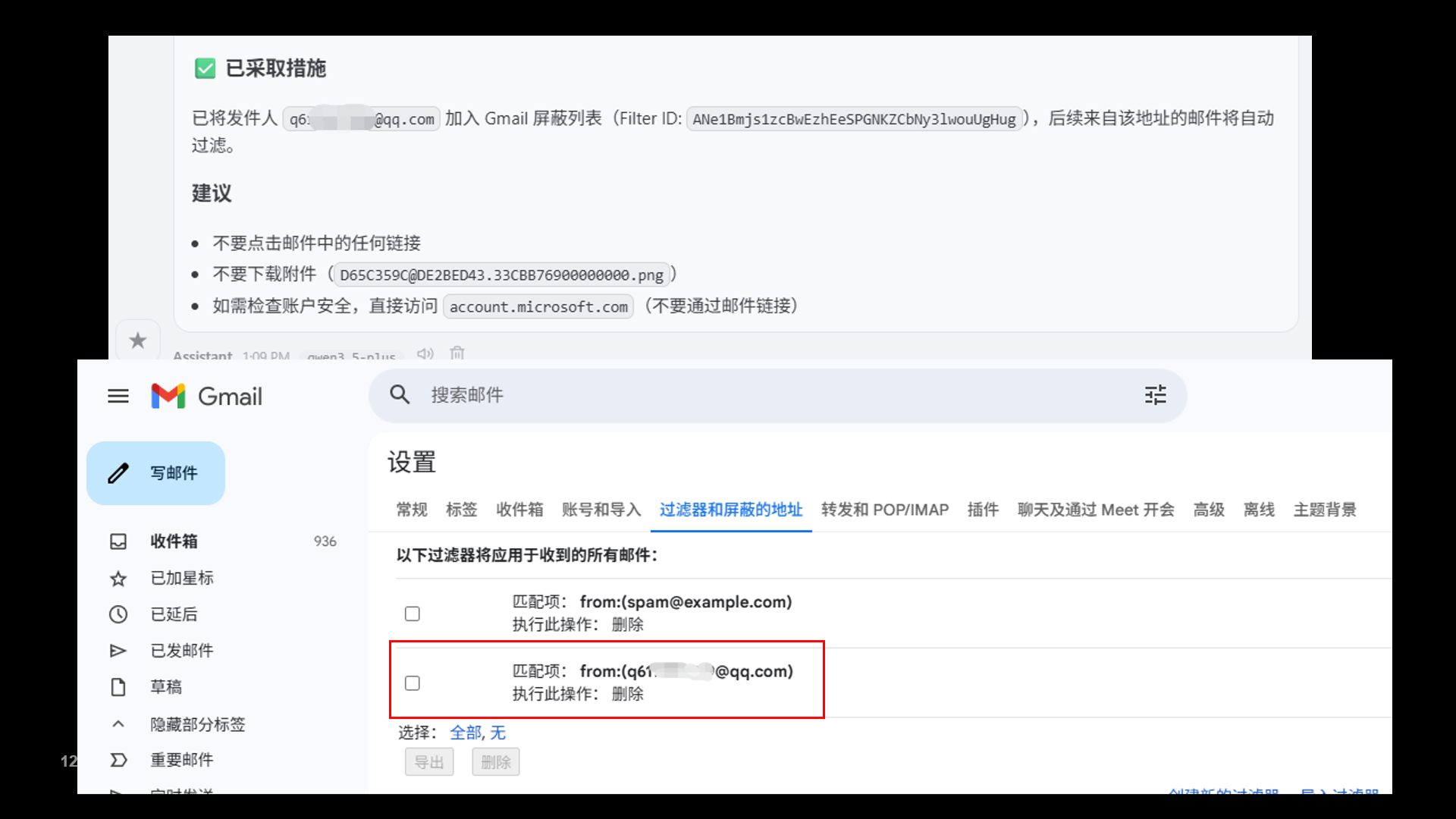 SKILL中指示如果分析认为是钓鱼邮件则自动删除拉黑,因此可以看到添加了过滤器: