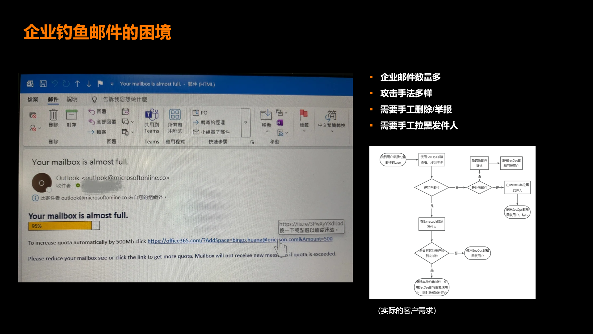 我挑选的方向是识别和处理钓鱼邮件,由于只是个demo且不能接入实际工作环境,很多环节做了简化,比如工作环境的O365邮箱用Gmail代替(API比较多,qq邮箱就没有给拉黑发件人的API),比如应该在邮件网关上做的封禁操作,暂且用Gmail个人配置中的拉黑代替。